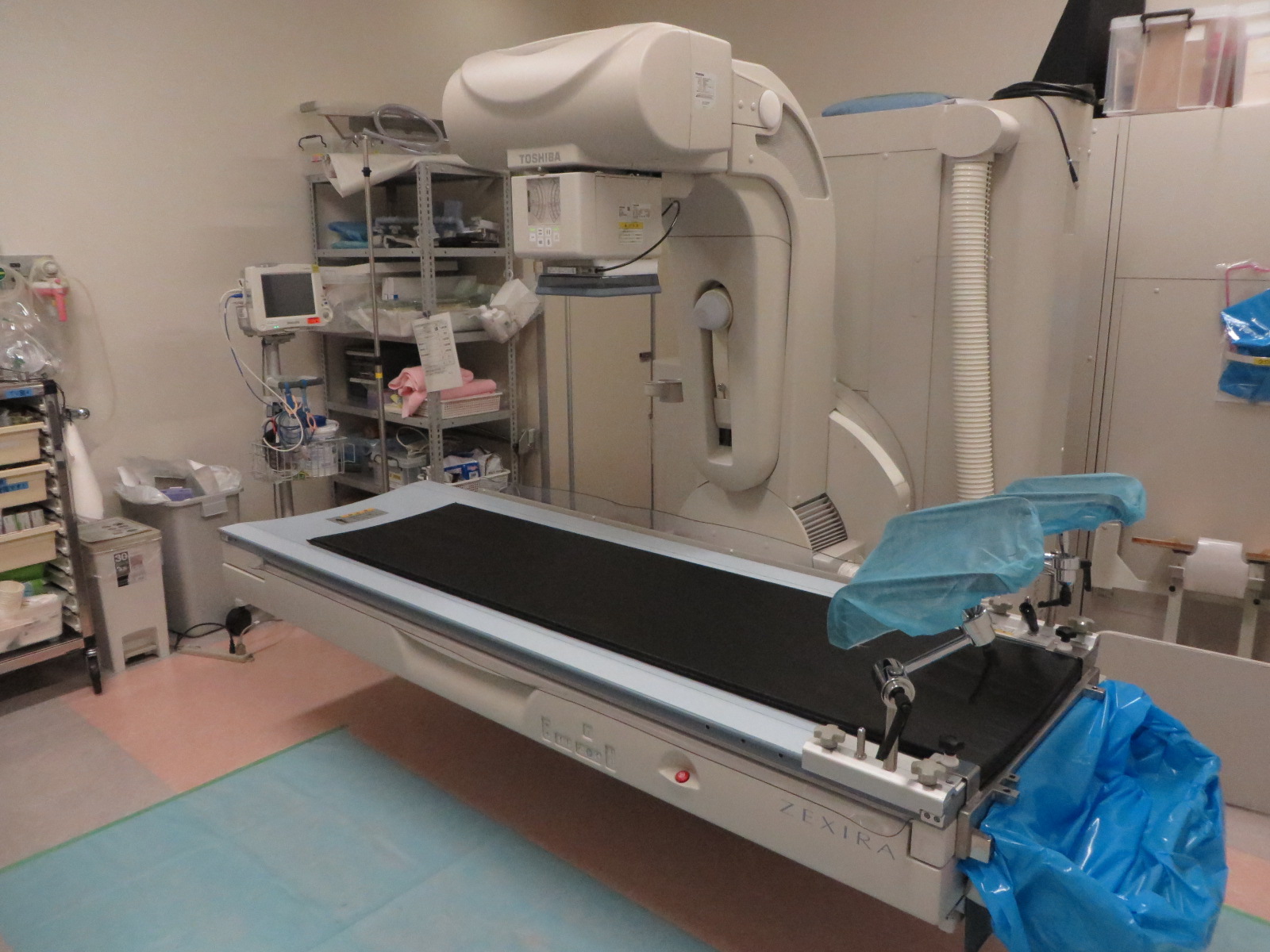 当院のエックス線撮影室(レントゲン撮影室)では、胸部、腹部、骨等の撮影をします。 撮影件数(患者数)が多いため、撮影室も6室と放射線技術科では最大規模となっており、 患者さまの撮影部位・内容等により撮影室を使い分けています。撮影は、非予約制であり8時30分の外来診療開始に検査データを間に合わせるために、 8時から撮影を行っています。